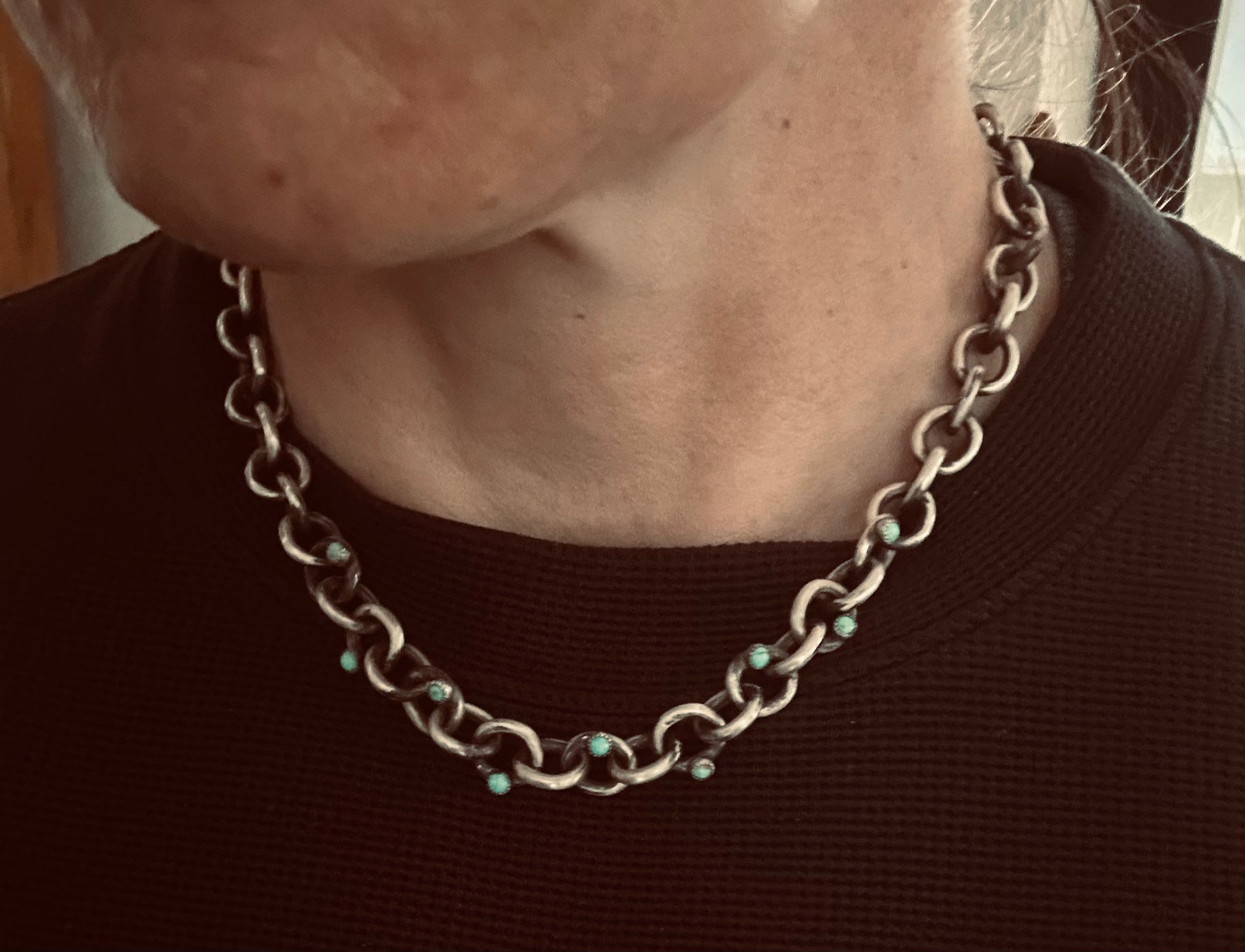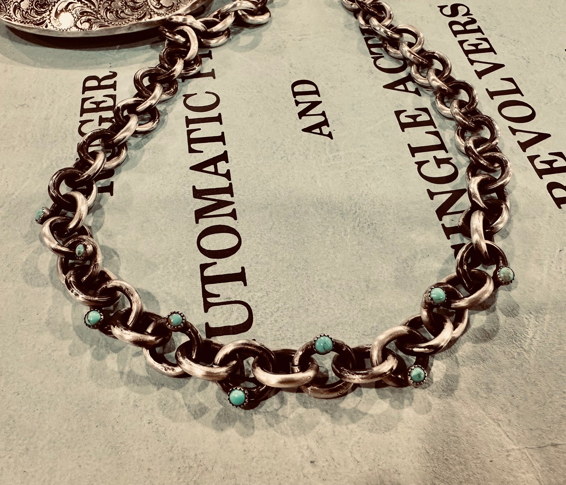 If you start your Sunday with hay in your hair, make it to church with some dust on your jeans, swing by your mama’s for suppers and might need a safety chain for the gate when the cows get out, this is for you! It’s heavy sterling links with a sprinkle of Carico Lake turquoise. Everybody needs a sprinkle. 15” total length for choker length or longer, chose in the options.