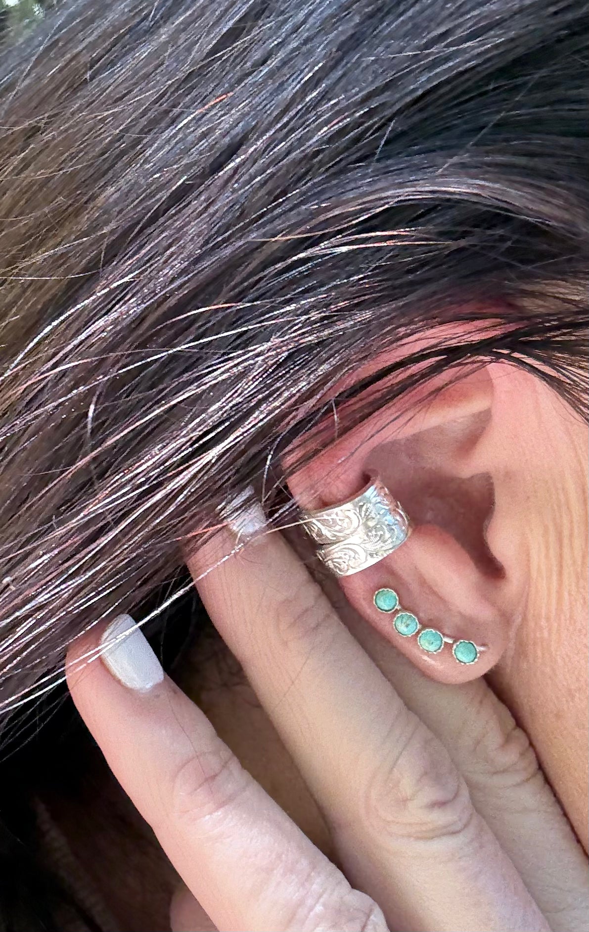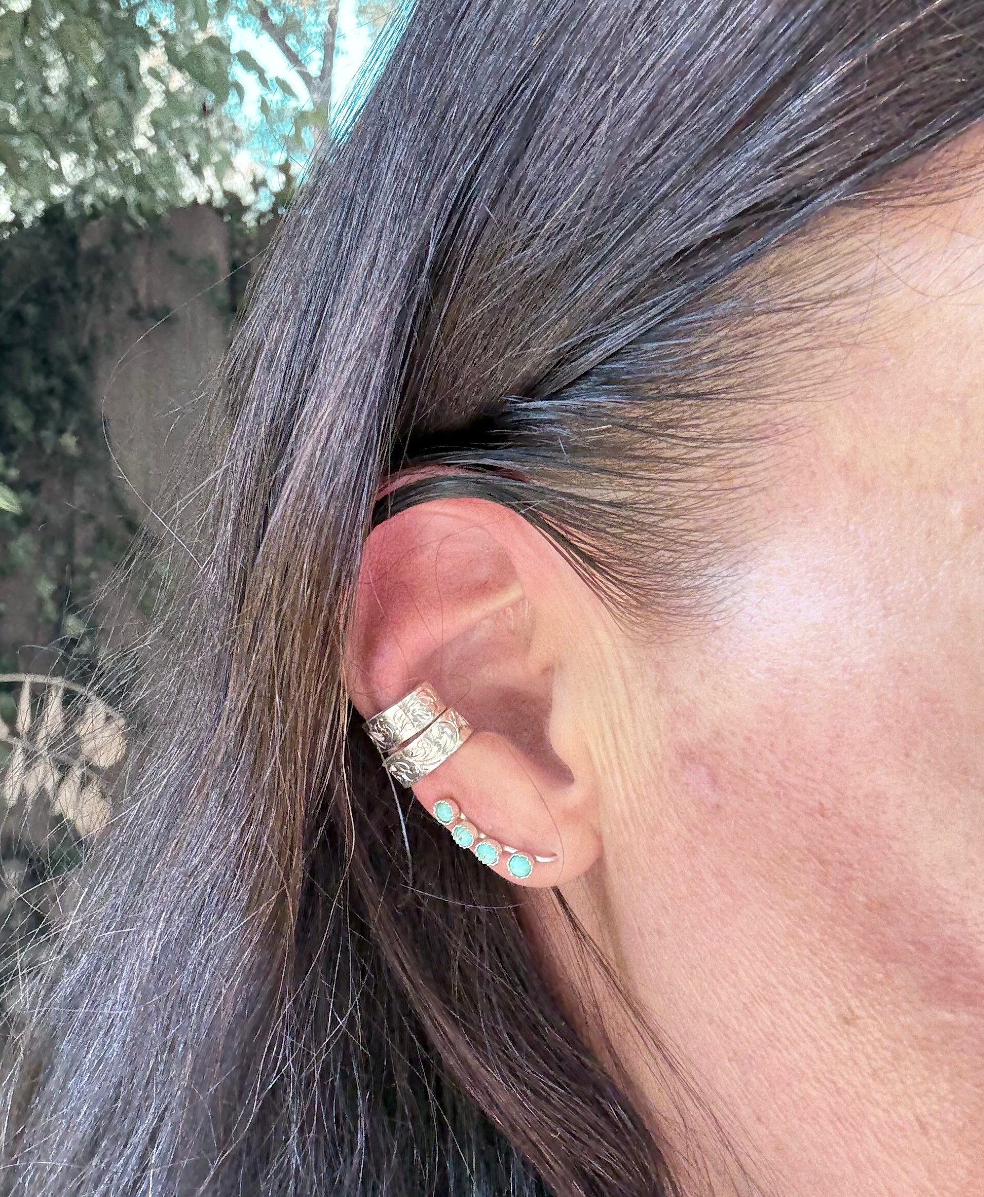 Sterling Silver heavy gauge ear cuff. No piercing required as slides on natural shape of ear. Super comfortable and super secure, there is no need (nor reason!) to take this off to sleep or rock n roll.