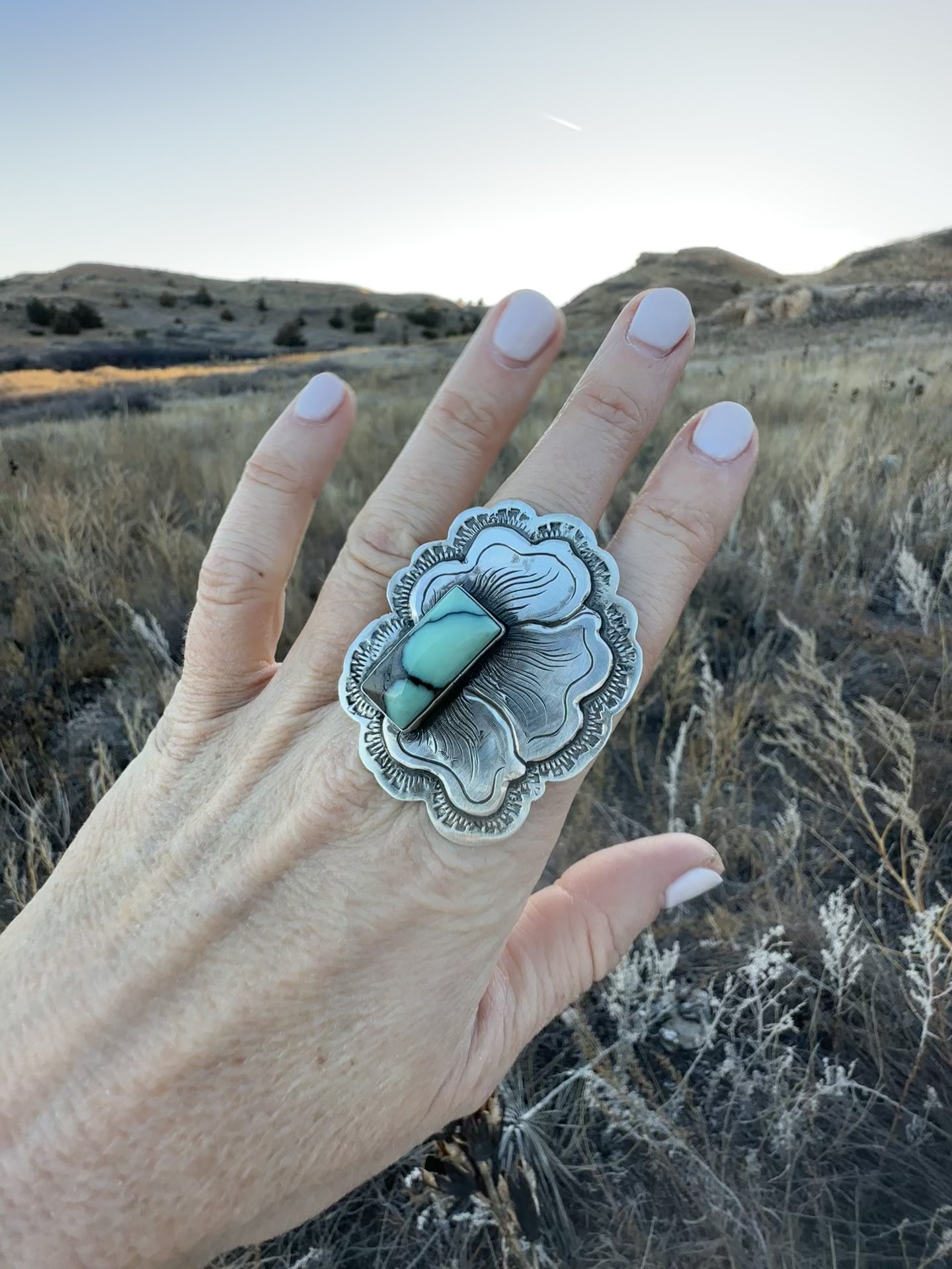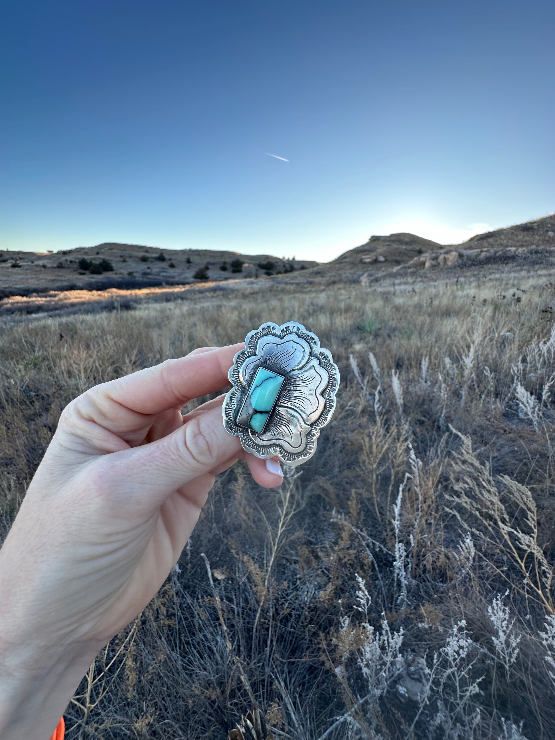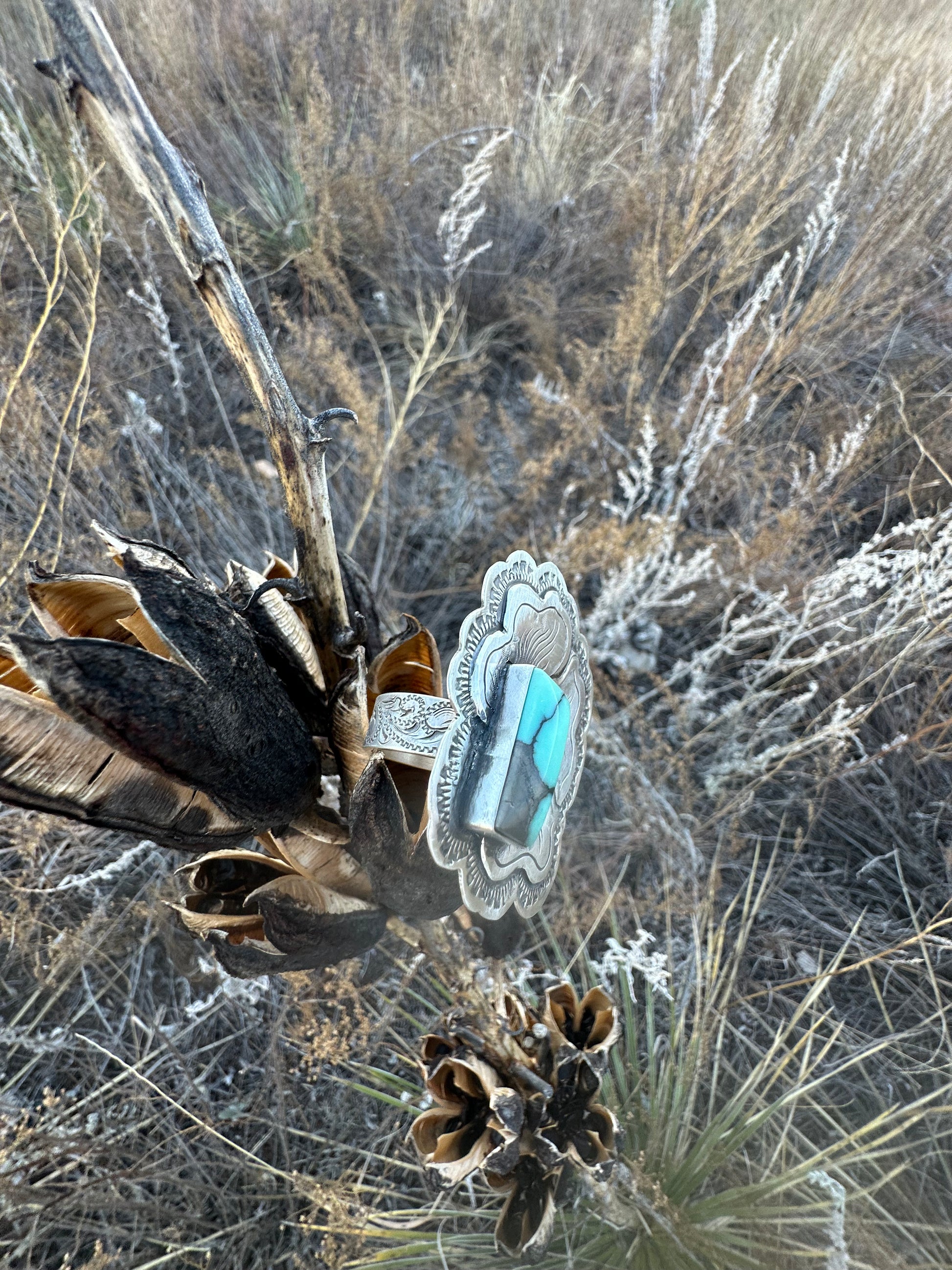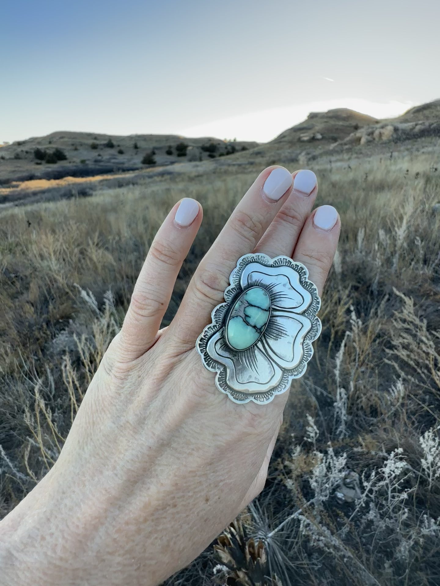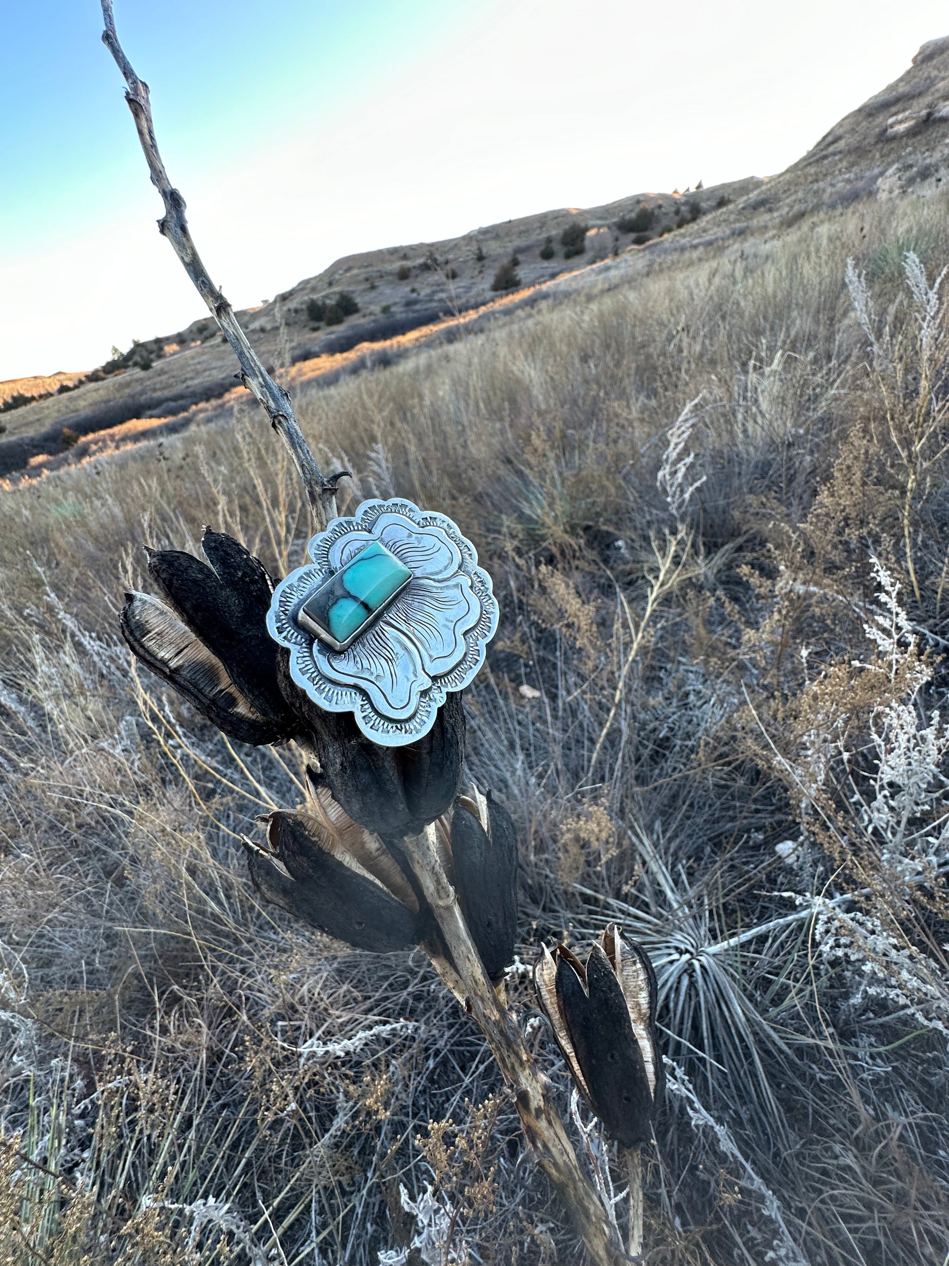 I knew the moment I saw these stones I wanted to make them a flower center. Desert Bloom stones in engraved Sterling Silver.
