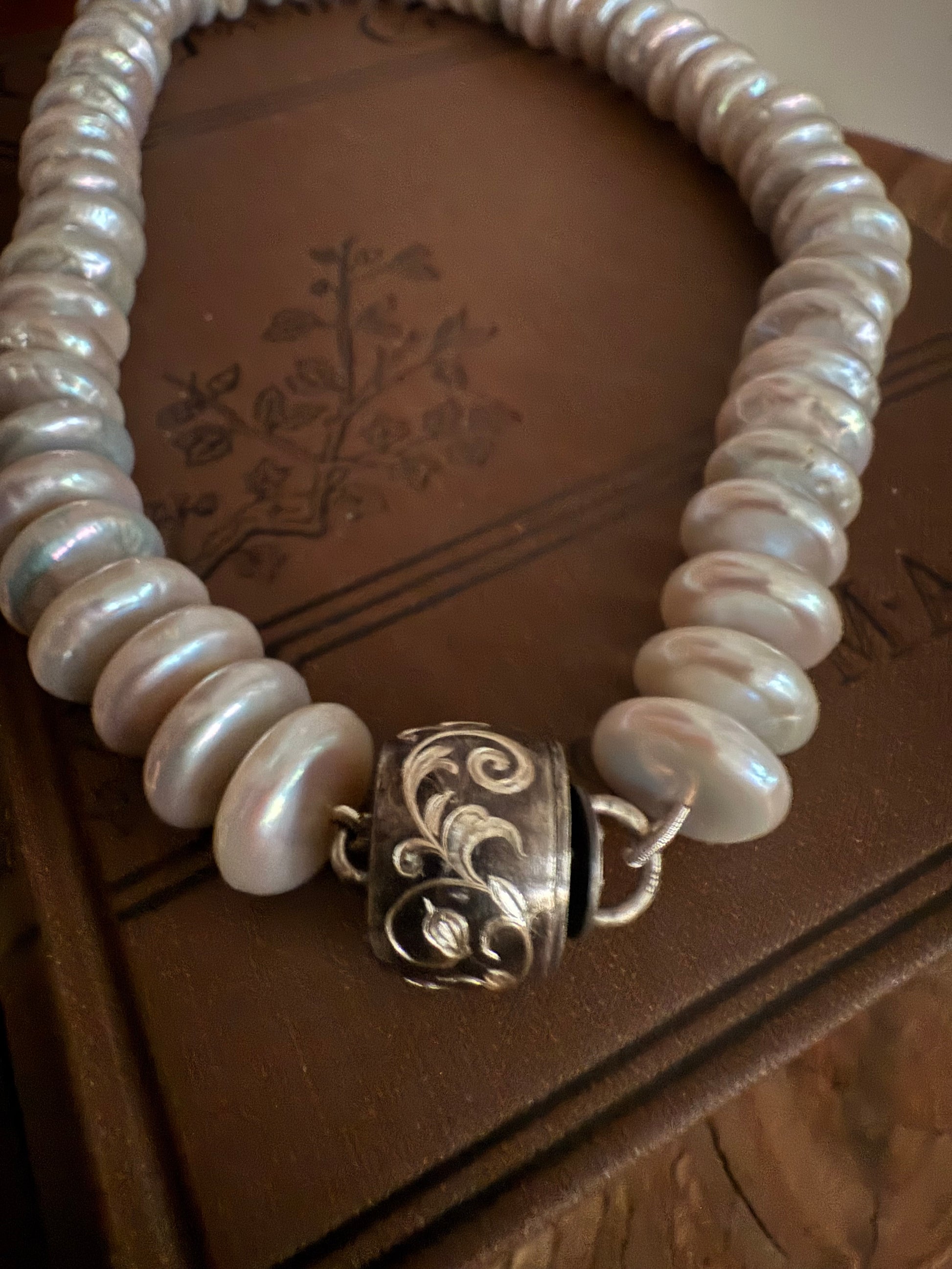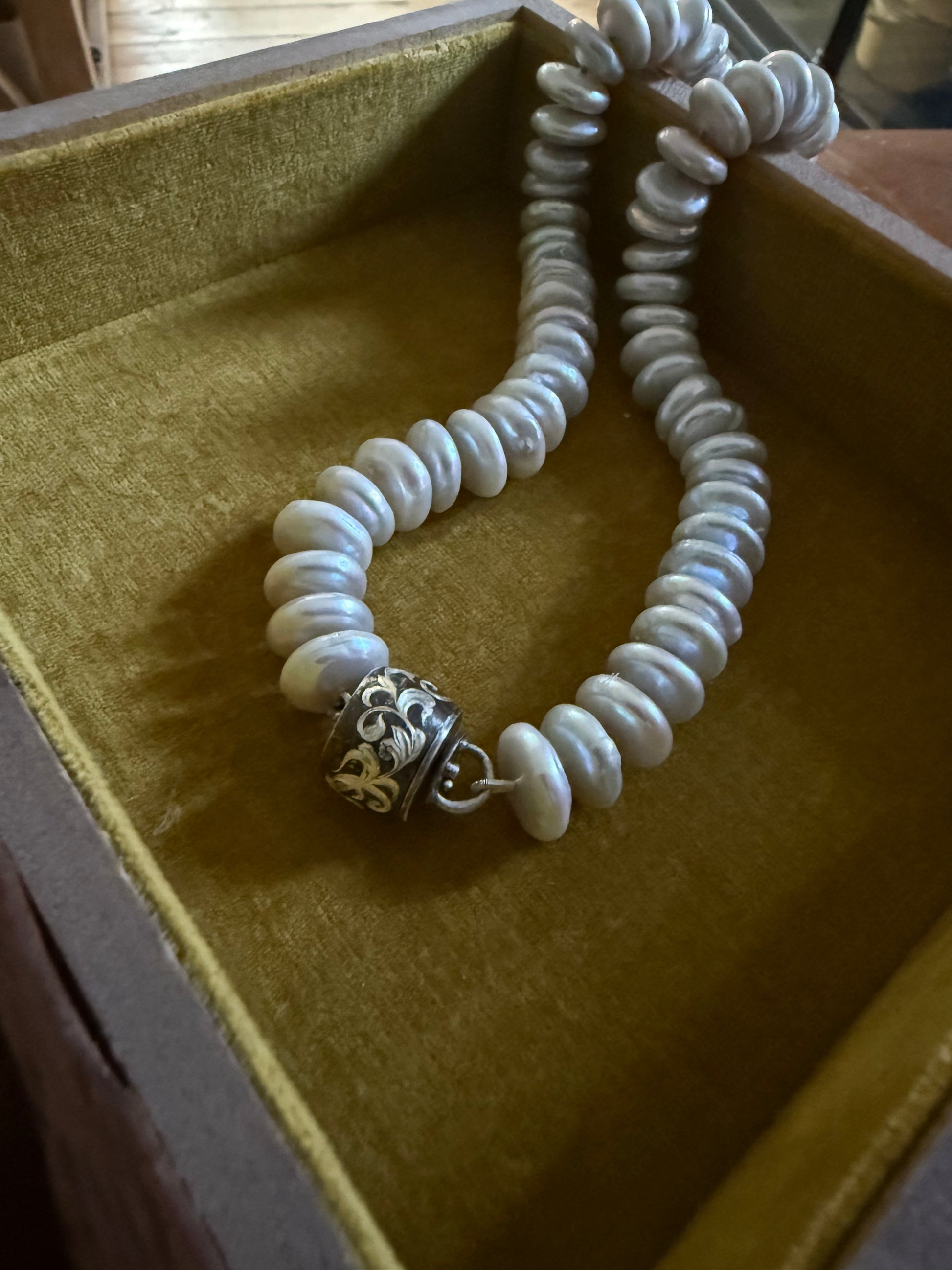 Hand fabricated Sterling silver clasp, engraved in Flair style. The freshwater coin pearls are light grey and high luster. I hand knotted them using traditional pearl knotting and silk thread. The clasp has a swivel so when turning the clasp the strong of pearls will remain structurally perfect. 15.5” long.
