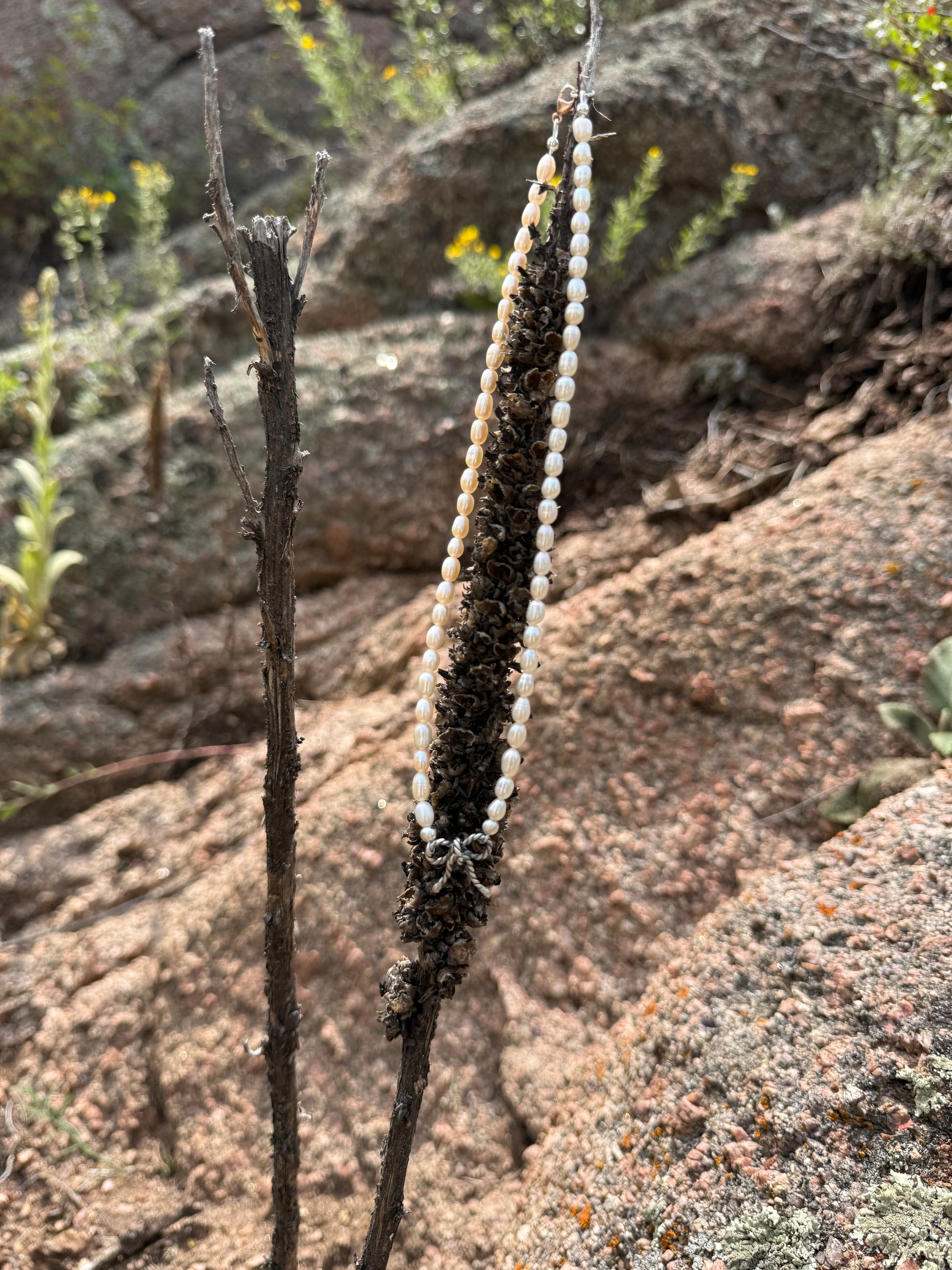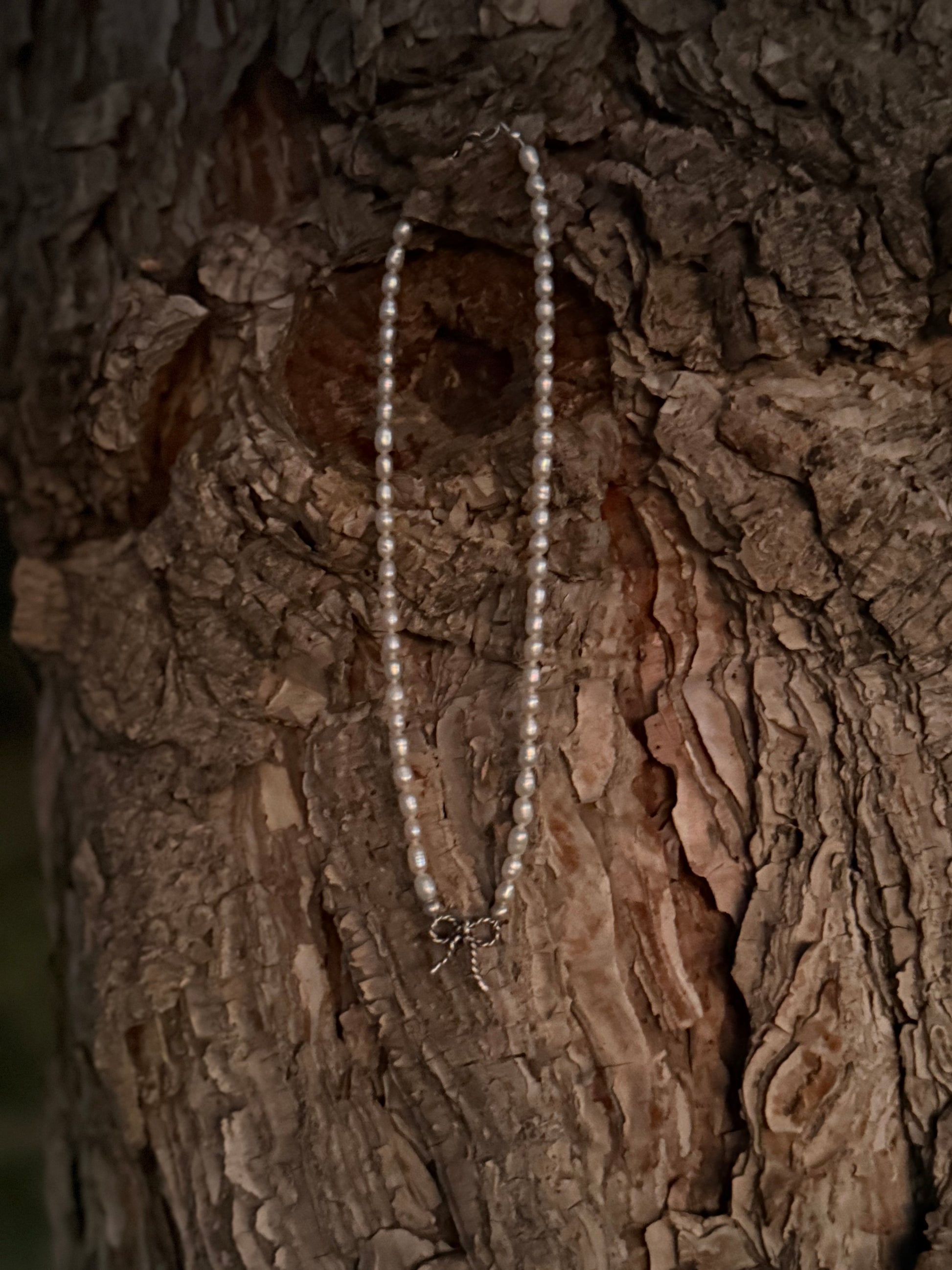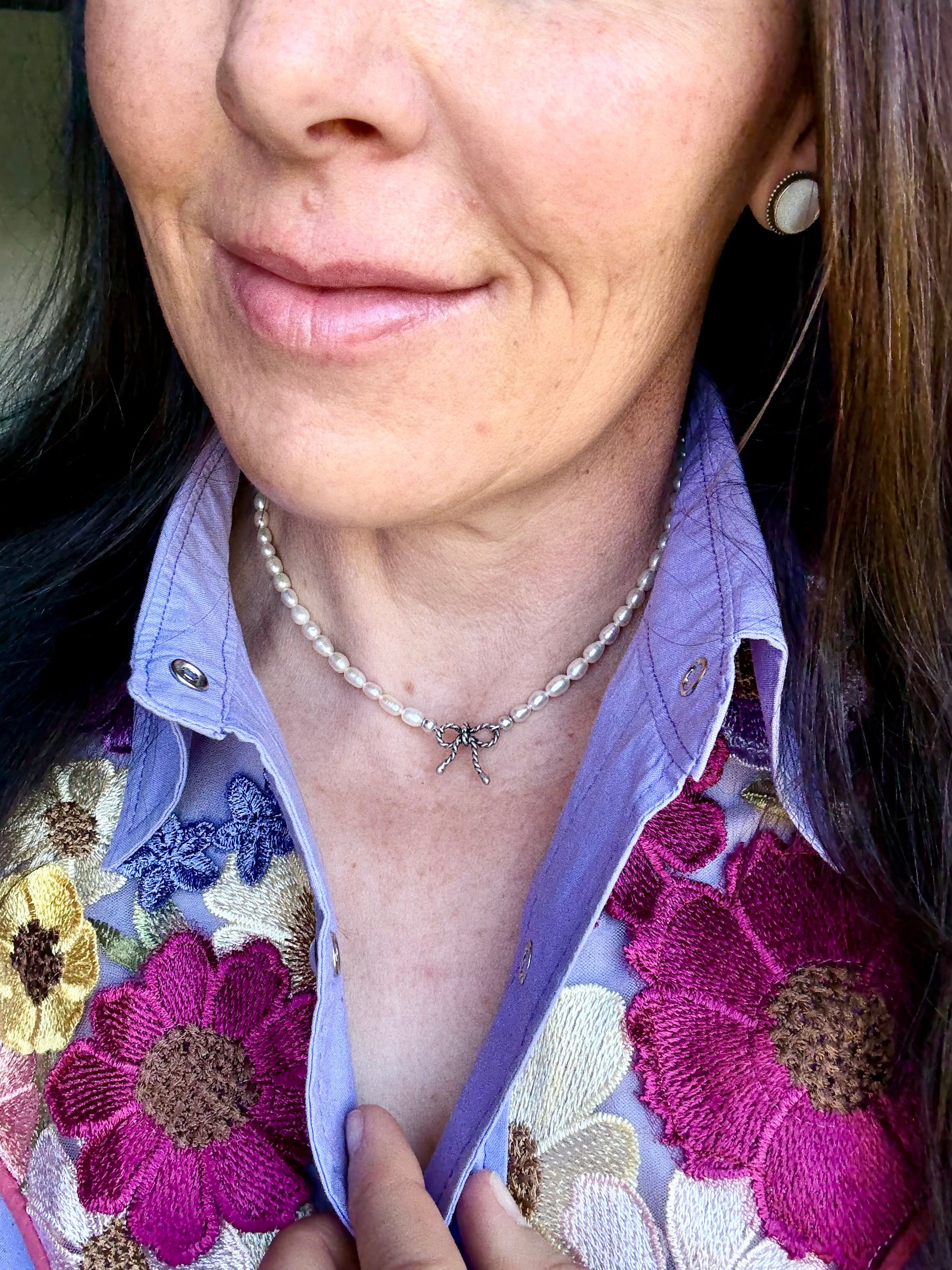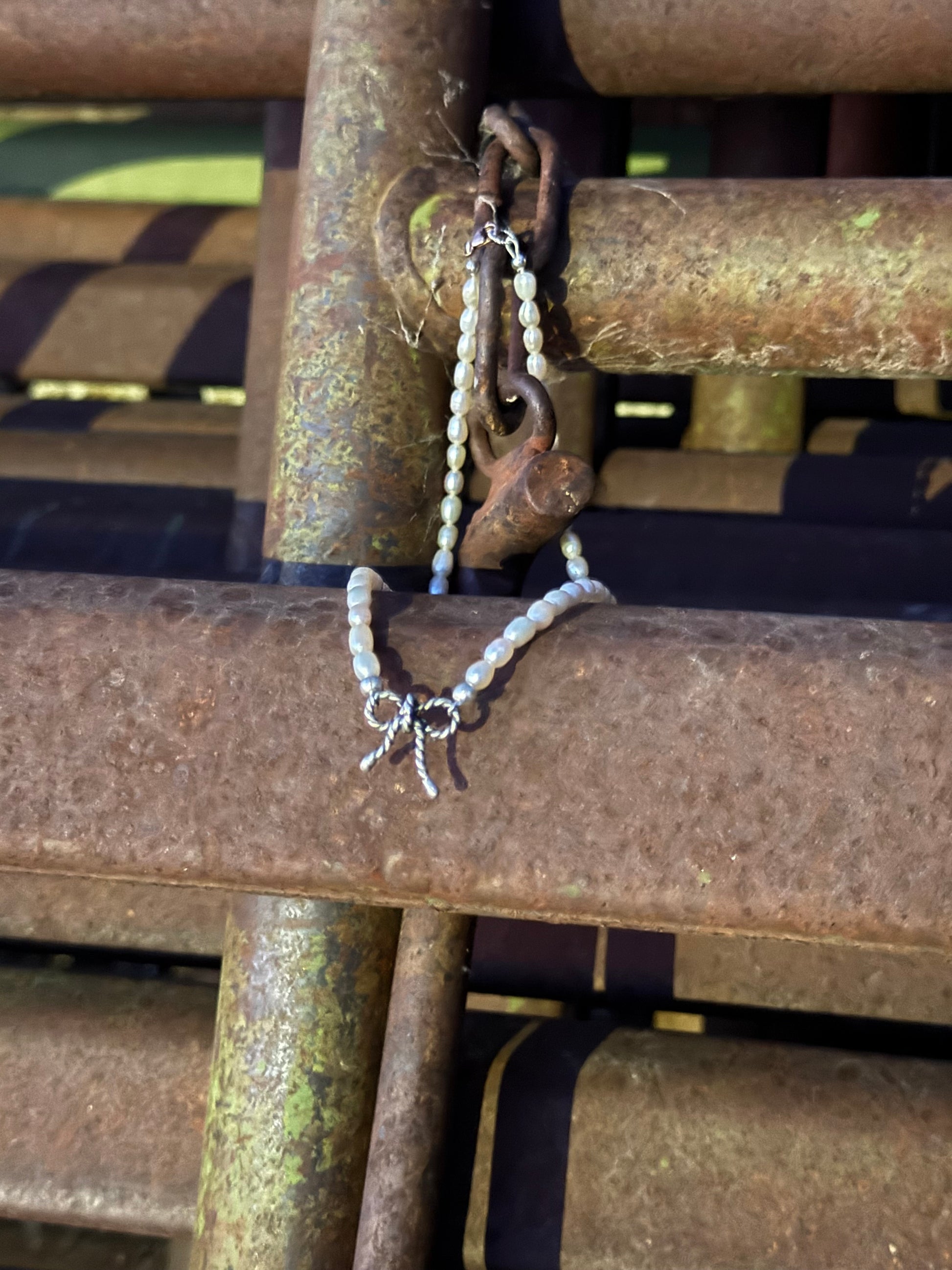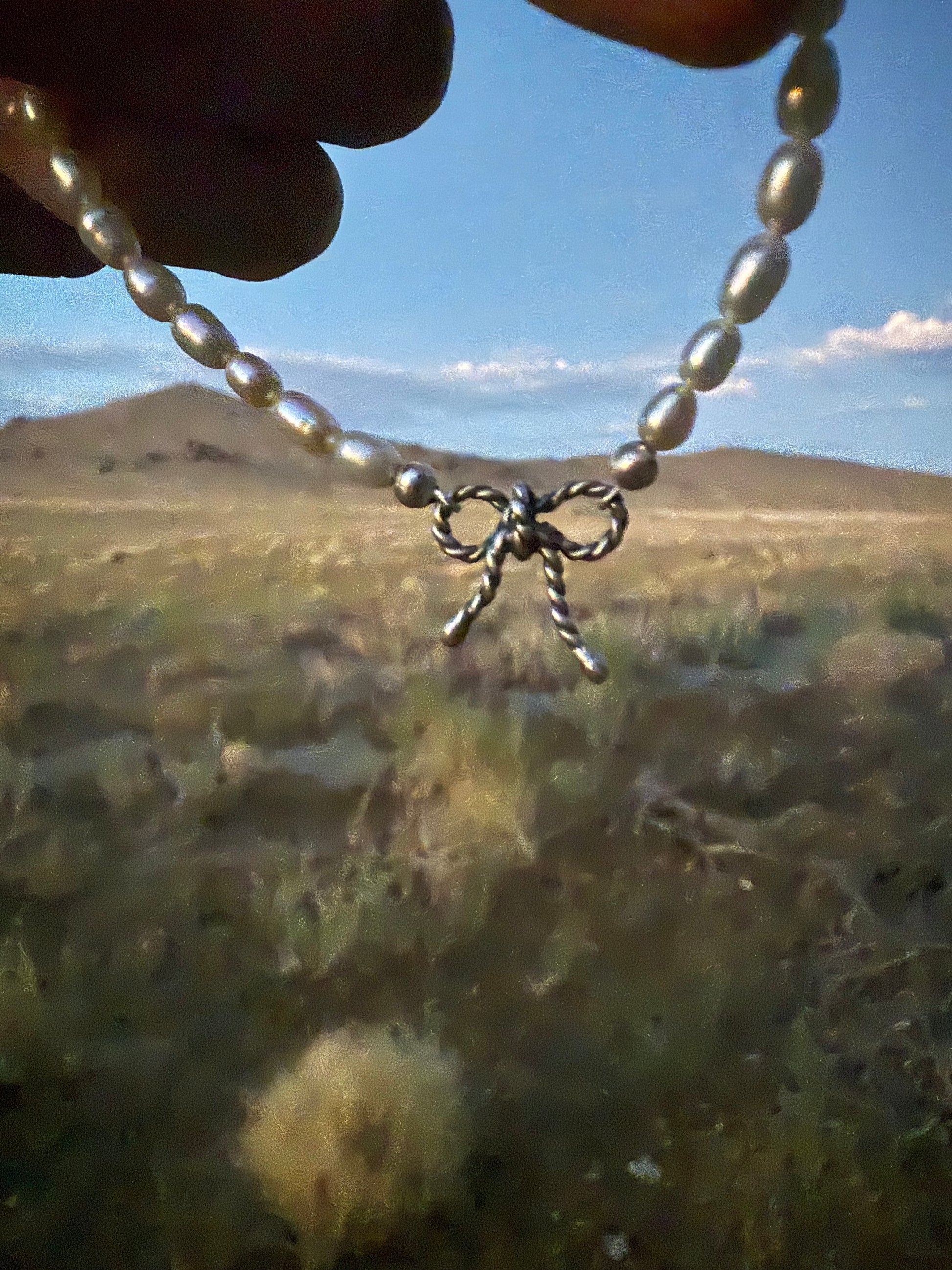Hand made sterling silver bow with freshwater natural ivory pearls strung on sterling silver with sterling silver clasp. These are 15.75” long and meant for everyday wear. Tough little cuties!